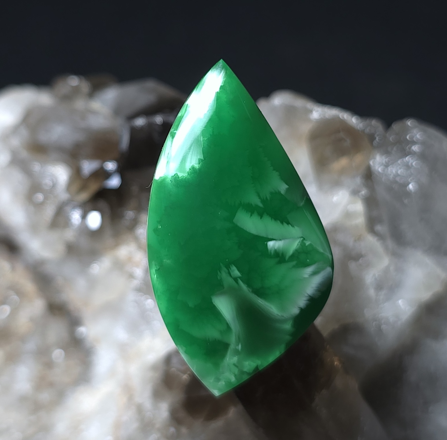 A stunning emerald-green Victoria Stone cabochon, expertly shaped and polished by Ben Kaniuth Lapidary. Its unmatched chatoyancy and fanning patterns make it a true collector’s treasure. Victoria Stone is an extremely scarce, early-1960s manmade gem—highly sought after and rarely seen today.