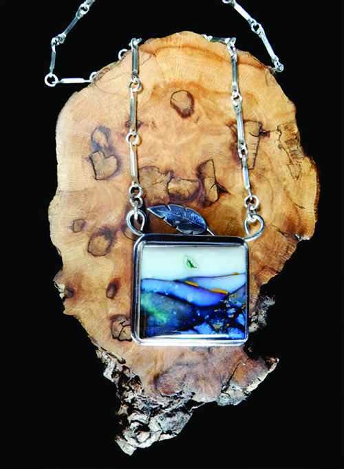 “I cabbed this piece of Indonesian Opal Wood to frame the floating feather/leaf above the landscape scene because it reminded me so much of where I stay in Oregon, surrounded by trees and beauty,” said Herfindahl. “The fine silver frame that I fabricated to hold it was in need of one single feather/leaf to accent the stone and complete my vision.”