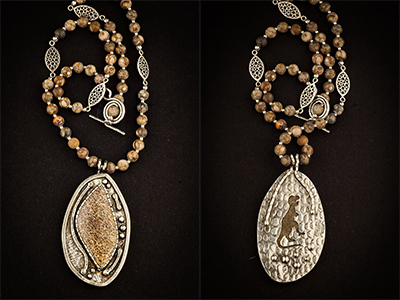 “The beauty, depth, and character of the stone was an inspiration in itself, however, the shape was fun and so I wanted to highlight it,” states Cheryl Ruby Dole. “I added the trim that was a bit different on each side and tied it all together with an accenting bail that would hang bring attention to the shape and beauty of the cabochon.”
