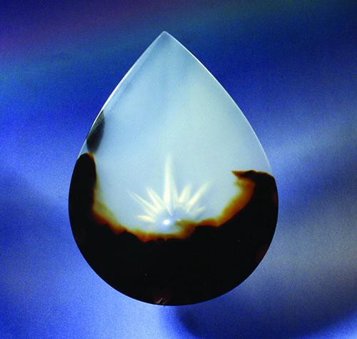 I shaped and cabbed the slab as a prelude to locating the ideal placement and shape of the feature that I was going to carve on the back. The carving process started by using a small, round diamond bur to locate the center of the soon-to-be-larger round depression. Next, I enlarged the feature with various grit ½-inch diamond burs and ground about halfway through the agate. I verified that the feature would show through the front of the translucent agate material.