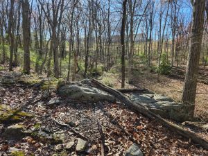 I revisited Mineral Hill in mid-April 2024. This time, I approached the area from the parking lot along East Baltimore Pike. I was able to find the Boy Scout ruins easily, but the pit was surprisingly hard to find again. There are still no distinct trails that lead to it, and I got sliced to ribbons by briars again. I eventually made it back to the pit and found there were more holes made by rockhounds. Stacks of microcline made by visitors were also in the small gully to the north. Mineral Hill is often visited by rockhounds, but fortunately people have generally respected the area, and it was relatively free of trash or other indications of inconsiderate visitors.