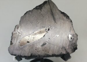 A smaller Saint-Aubin meteorite slice reveals classic Widmanstätten patterns, along with inclusions of troilite and schreibersite.