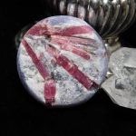 The rose-pink color of the tourmaline variety known as rubellite and how it contrasts with the lilac-gray of...